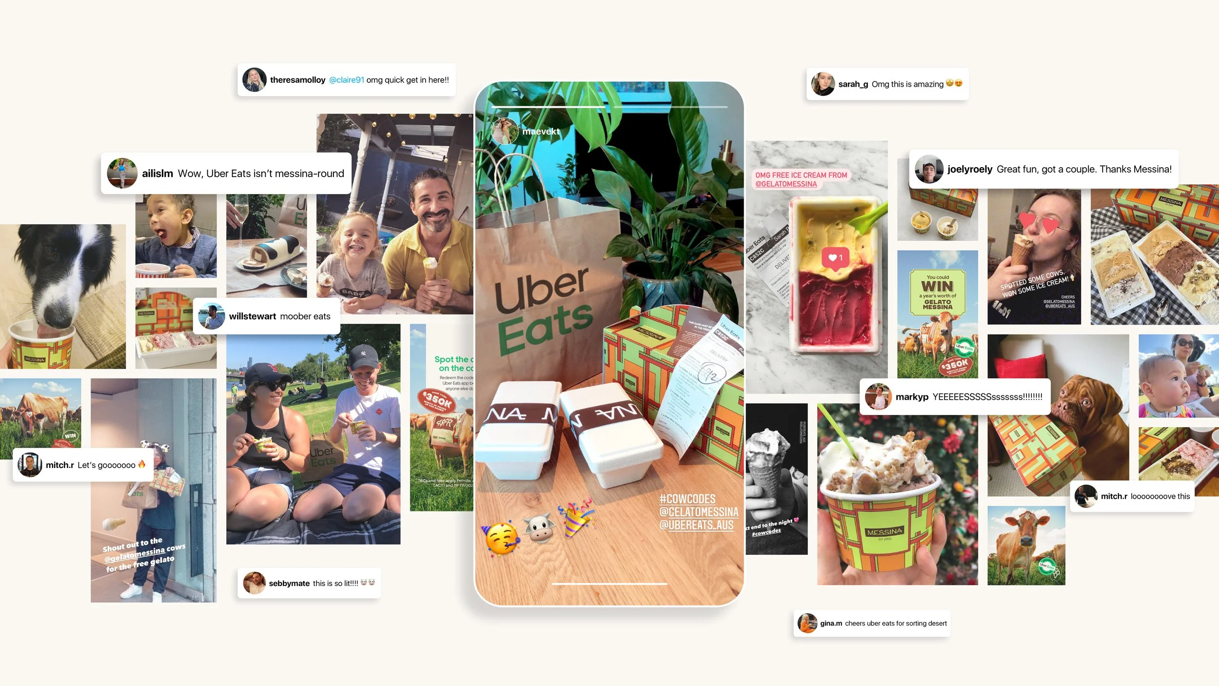 To celebrate Gelato Messina moving its delivery exclusively to Uber Eats, we created a social activation that starred their exclusive gelato makers: their free-range cows (the “unsung heroes” of its artisan gelato). We used Instagram Live to stream the Jersey cows in their natural glory wearing jerseys, with promo codes. Viewers had to spot and redeem the code on the Uber Eats app.